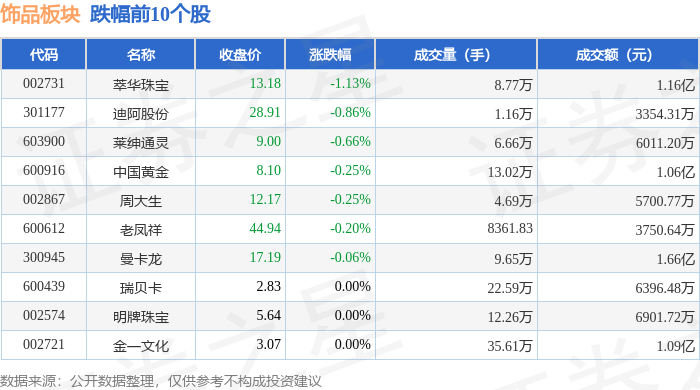 证券之星消息,12月24日饰品板块较上一交易日下跌0.14%,萃华珠宝领跌。当日上证指数报收于3940.95,上涨0.53%。深证成指报收于13486.42,上涨0.88%。饰品板块个股涨跌见下表: