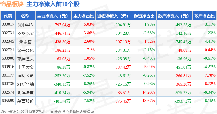 从资金流向上来看,当日饰品板块主力资金净流出3199.06万元,游资资金净流入1570.68万元,散户资金净流入1628.38万元。饰品板块个股资金流向见下表: