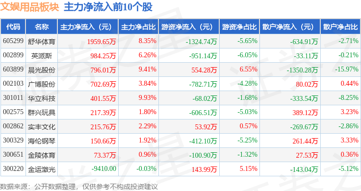 从资金流向上来看,当日文娱用品板块主力资金净流出6233.56万元,游资资金净流出611.29万元,散户资金净流入6844.85万元。文娱用品板块个股资金流向见下表: