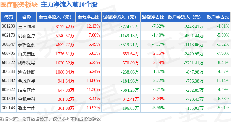 从资金流向上来看,当日医疗服务板块主力资金净流出2.51亿元,游资资金净流出7628.47万元,散户资金净流入3.27亿元。医疗服务板块个股资金流向见下表: