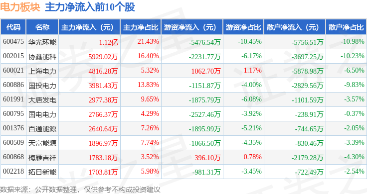 从资金流向上来看,当日电力板块主力资金净流出9415.1万元,游资资金净流出6185.34万元,散户资金净流入1.56亿元。电力板块个股资金流向见下表: