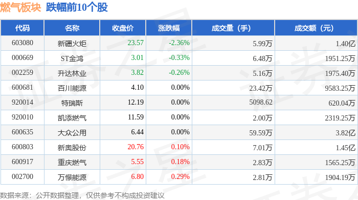 证券之星消息,12月24日燃气板块较上一交易日上涨1.72%,九丰能源领涨。当日上证指数报收于3940.95,上涨0.53%。深证成指报收于13486.42,上涨0.88%。燃气板块个股涨跌见下表: