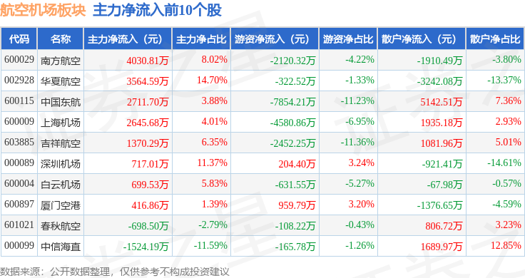 从资金流向上来看,当日航空机场板块主力资金净流出2138.48万元,游资资金净流出1.49亿元,散户资金净流入1.71亿元。航空机场板块个股资金流向见下表:
