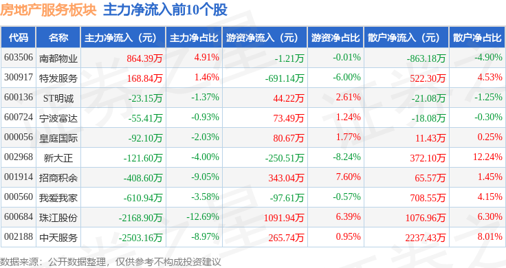 从资金流向上来看,当日房地产服务板块主力资金净流出7890.3万元,游资资金净流入2704.84万元,散户资金净流入5185.45万元。房地产服务板块个股资金流向见下表: