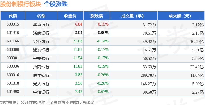 证券之星消息,12月24日股份制银行板块较上一交易日下跌0.22%,中信银行领跌。当日上证指数报收于3940.95,上涨0.53%。深证成指报收于13486.42,上涨0.88%。股份制银行板块个股涨跌见下表: