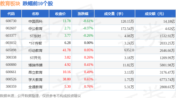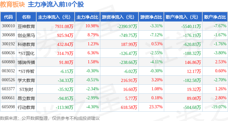 从资金流向上来看,当日教育板块主力资金净流出5316.42万元,游资资金净流出823.43万元,散户资金净流入6139.85万元。教育板块个股资金流向见下表: