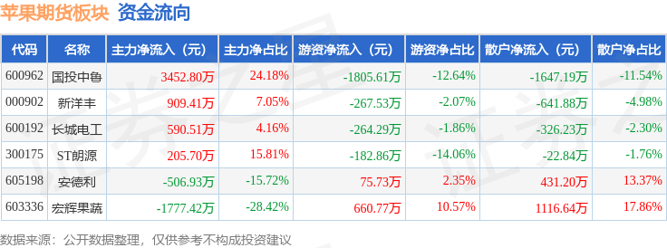 从资金流向上来看,当日苹果期货板块主力资金净流入2874.08万元,游资资金净流出1783.78万元,散户资金净流出1090.3万元。苹果期货板块个股资金流向见下表: