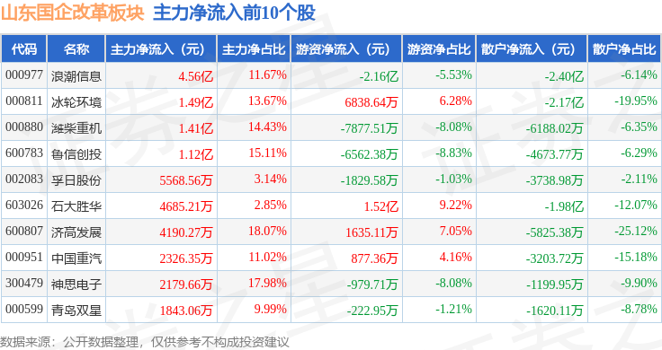 从资金流向上来看,当日山东国企改革板块主力资金净流入7.2亿元,游资资金净流出3.47亿元,散户资金净流出3.73亿元。山东国企改革板块个股资金流向见下表: