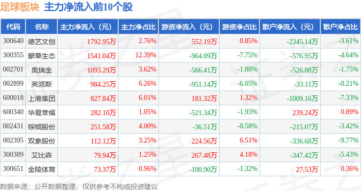 从资金流向上来看,当日足球板块主力资金净流出1.38亿元,游资资金净流出3491.01万元,散户资金净流入1.73亿元。足球板块个股资金流向见下表: