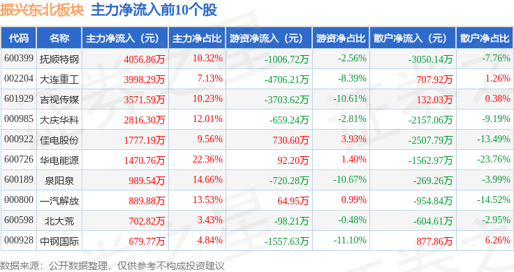 从资金流向上来看,当日振兴东北板块主力资金净流出3.0亿元,游资资金净流入3241.69万元,散户资金净流入2.67亿元。振兴东北板块个股资金流向见下表: