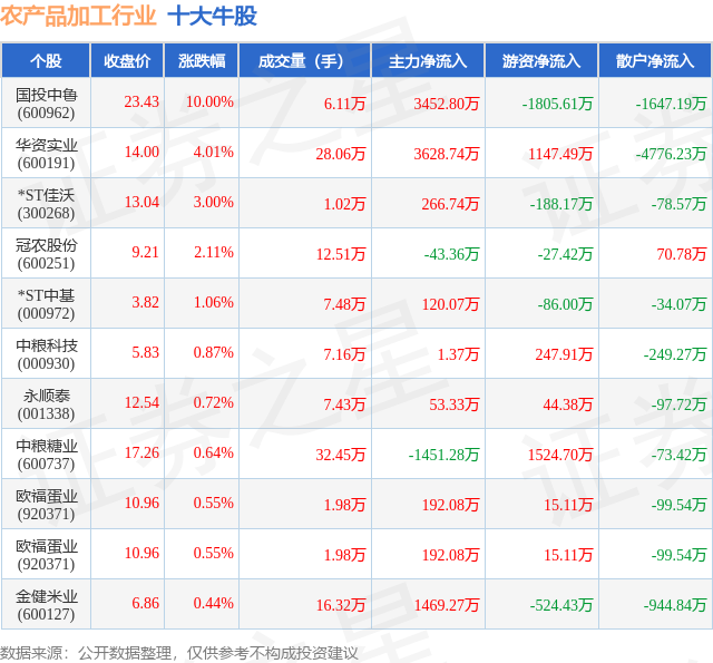 个股表现方面,农产品加工行业当日领涨股为国投中鲁(600962),该股当日报收23.43,上涨10.0%,成交量6.11万,主力资金净流入3452.8万元。华资实业(600191)以上涨4.01%紧随其后,该股当日成交量28.06万,主力资金净流入3628.74万元。除此之外,*ST佳沃(300268)、冠农股份(600251)、*ST中基(000972)均进入当日牛股之列。具体个股列表见下表: