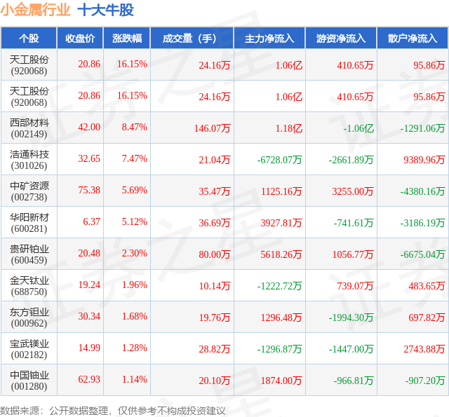个股表现方面,小金属行业当日领涨股为天工股份(920068),该股当日报收20.86,上涨16.15%,成交量24.16万,主力资金净流入1.06亿元。天工股份(920068)以上涨16.15%紧随其后,该股当日成交量24.16万,主力资金净流入1.06亿元。除此之外,西部材料(002149)、浩通科技(301026)、中矿资源(002738)均进入当日牛股之列。具体个股列表见下表: