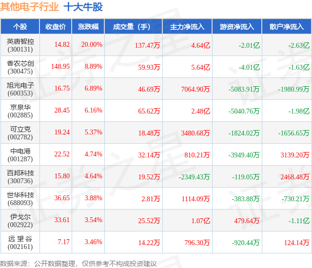 个股表现方面,其他电子行业当日领涨股为英唐智控(300131),该股当日报收14.82,上涨20.0%,成交量137.47万,主力资金净流入4.64亿元。香农芯创(300475)以上涨8.89%紧随其后,该股当日成交量59.93万,主力资金净流入5.64亿元。除此之外,旭光电子(600353)、京泉华(002885)、可立克(002782)均进入当日牛股之列。具体个股列表见下表: