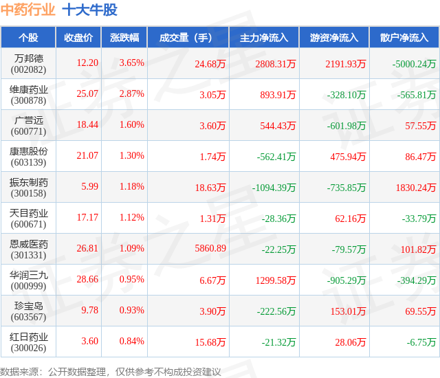 个股表现方面,中药行业当日领涨股为万邦德(002082),该股当日报收12.2,上涨3.65%,成交量24.68万,主力资金净流入2808.31万元。维康药业(300878)以上涨2.87%紧随其后,该股当日成交量3.05万,主力资金净流入893.91万元。除此之外,广誉远(600771)、康惠股份(603139)、振东制药(300158)均进入当日牛股之列。具体个股列表见下表: