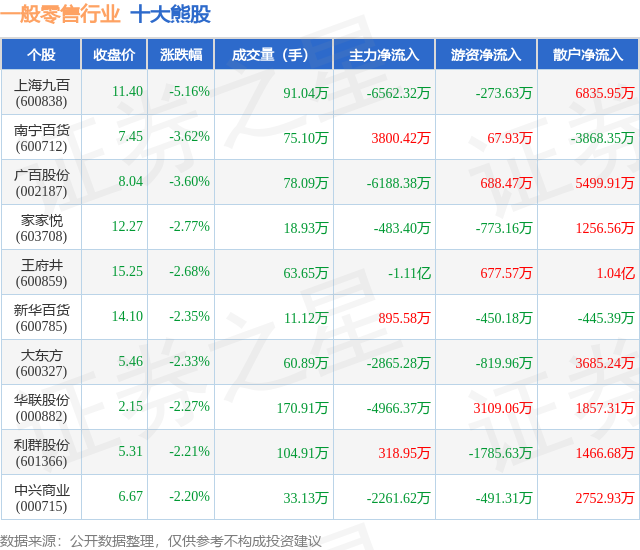 个股表现方面,一般零售行业当日领跌股为上海九百(600838),该股当日报收11.4,下跌5.16%,成交量91.04万,主力资金净流出6562.32万元。南宁百货(600712)以下跌3.62%紧随其后,该股当日成交量75.1万,主力资金净流入3800.42万元。除此之外,广百股份(002187)、家家悦(603708)、王府井(600859)均进入当日熊股之列。具体个股列表见下表:
