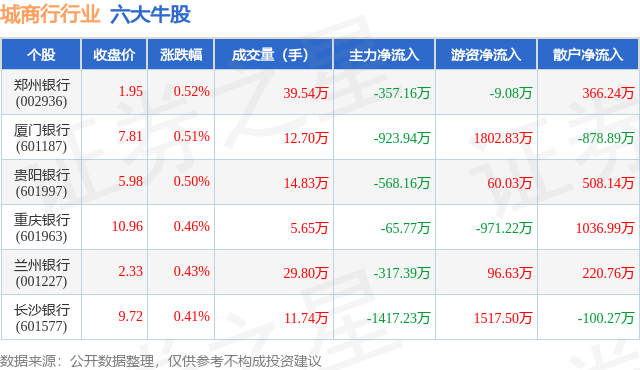 个股表现方面,城商行行业当日领涨股为郑州银行(002936),该股当日报收1.95,上涨0.52%,成交量39.54万,主力资金净流出357.16万元。厦门银行(601187)以上涨0.51%紧随其后,该股当日成交量12.7万,主力资金净流出923.94万元。除此之外,贵阳银行(601997)、重庆银行(601963)、兰州银行(001227)均进入当日牛股之列。具体个股列表见下表: