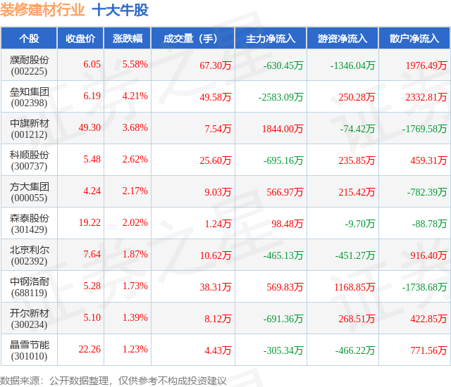 个股表现方面,装修建材行业当日领涨股为濮耐股份(002225),该股当日报收6.05,上涨5.58%,成交量67.3万,主力资金净流出630.45万元。垒知集团(002398)以上涨4.21%紧随其后,该股当日成交量49.58万,主力资金净流出2583.09万元。除此之外,中旗新材(001212)、科顺股份(300737)、方大集团(000055)均进入当日牛股之列。具体个股列表见下表: