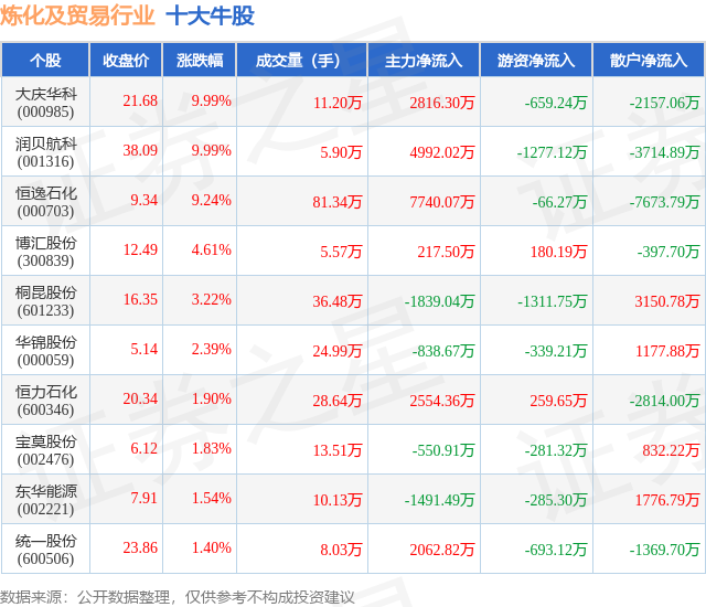 个股表现方面,炼化及贸易行业当日领涨股为大庆华科(000985),该股当日报收21.68,上涨9.99%,成交量11.2万,主力资金净流入2816.3万元。润贝航科(001316)以上涨9.99%紧随其后,该股当日成交量5.9万,主力资金净流入4992.02万元。除此之外,恒逸石化(000703)、博汇股份(300839)、桐昆股份(601233)均进入当日牛股之列。具体个股列表见下表: