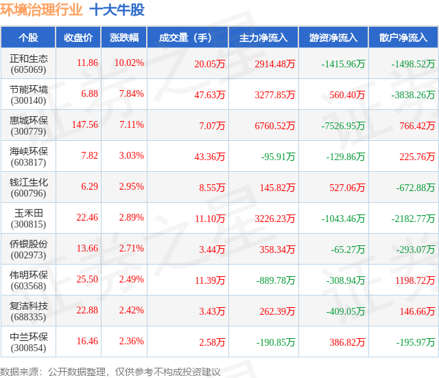 个股表现方面,环境治理行业当日领涨股为正和生态(605069),该股当日报收11.86,上涨10.02%,成交量20.05万,主力资金净流入2914.48万元。节能环境(300140)以上涨7.84%紧随其后,该股当日成交量47.63万,主力资金净流入3277.85万元。除此之外,惠城环保(300779)、海峡环保(603817)、钱江生化(600796)均进入当日牛股之列。具体个股列表见下表: