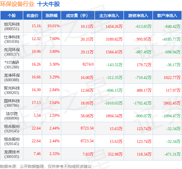 个股表现方面,环保设备行业当日领涨股为创元科技(000551),该股当日报收15.16,上涨10.01%,成交量10.13万,主力资金净流入1454.26万元。仕净科技(301030)以上涨7.6%紧随其后,该股当日成交量20.33万,主力资金净流入3189.82万元。除此之外,先河环保(300137)、*ST清研(301288)、龙净环保(600388)均进入当日牛股之列。具体个股列表见下表: