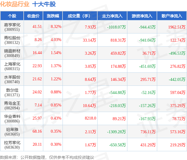 个股表现方面,化妆品行业当日领涨股为嘉亨家化(300955),该股当日报收41.51,上涨8.32%,成交量7.93万,主力资金净流出1018.07万元。青松股份(300132)以上涨4.03%紧随其后,该股当日成交量33.14万,主力资金净流入818.31万元。除此之外,锦盛新材(300849)、上海家化(600315)、水羊股份(300740)均进入当日牛股之列。具体个股列表见下表:
