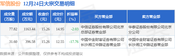证券之星消息,12月24日军信股份发生大宗交易,交易数据如下:
