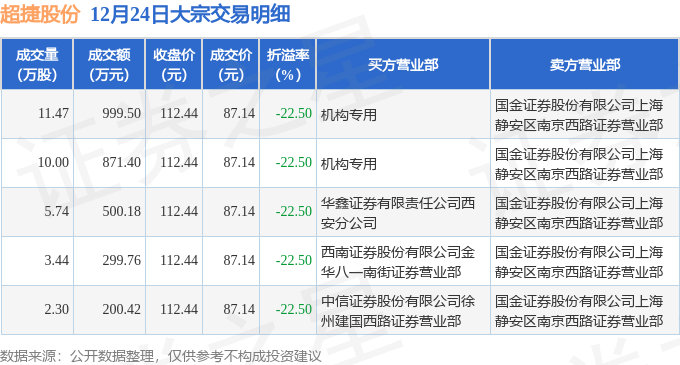 证券之星消息,12月24日超捷股份发生大宗交易,交易数据如下: