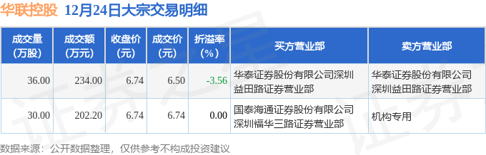 证券之星消息,12月24日华联控股发生大宗交易,交易数据如下: