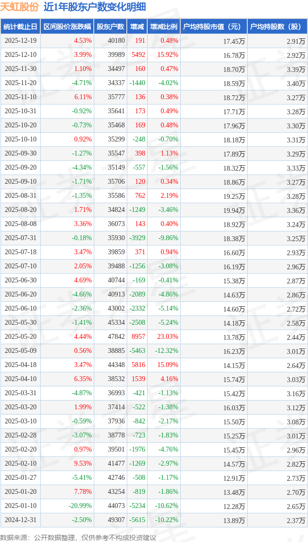 从股价来看,2025年12月10日至2025年12月19日,天虹股份区间涨幅为4.53%,在此期间股东户数增加191.0户,增幅为0.48%。