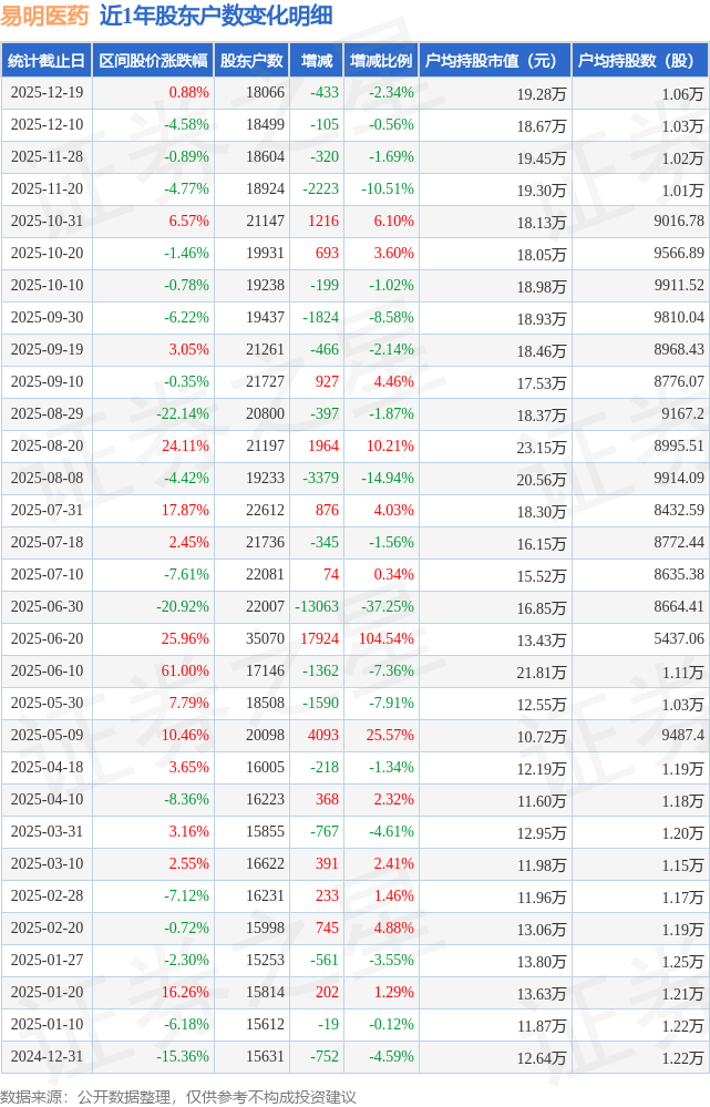 从股价来看,2025年12月10日至2025年12月19日,易明医药区间涨幅为0.88%,在此期间股东户数减少433.0户,减幅为2.34%。