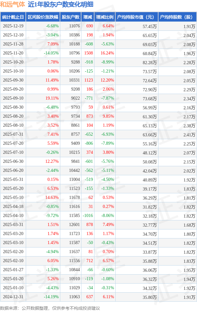 从股价来看,2025年12月10日至2025年12月19日,和远气体区间跌幅为6.68%,在此期间股东户数增加690.0户,增幅为6.64%。