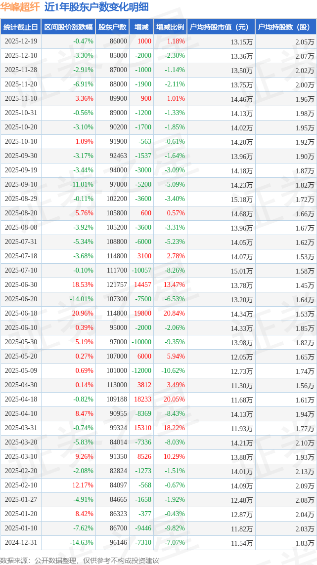 从股价来看,2025年12月10日至2025年12月19日,华峰超纤区间跌幅为0.47%,在此期间股东户数增加1000.0户,增幅为1.18%。