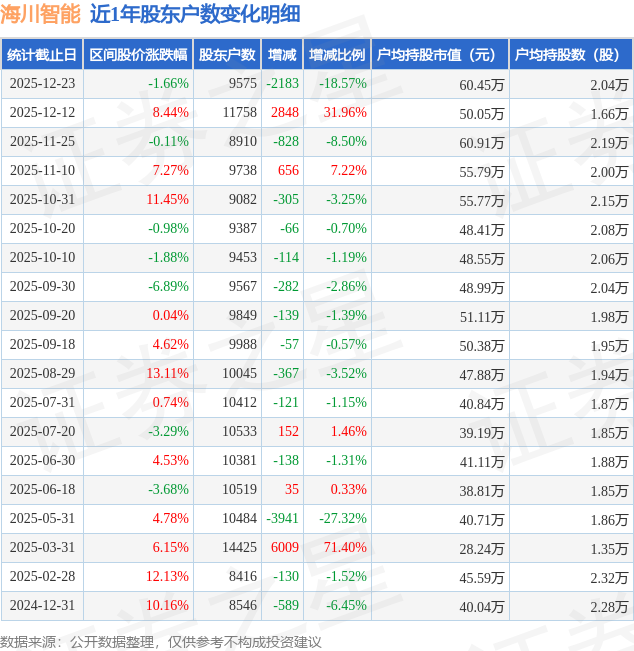 从股价来看,2025年12月12日至2025年12月23日,海川智能区间跌幅为1.66%,在此期间股东户数减少2183.0户,减幅为18.57%。