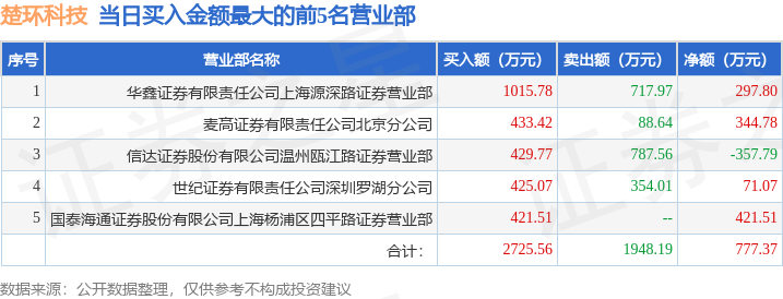 证券之星消息,沪深交易所2025年12月24日公布的交易公开信息显示,楚环科技(001336)因日跌幅偏离值达到7%的前5只证券登上龙虎榜。此次是近5个交易日内第3次上榜。