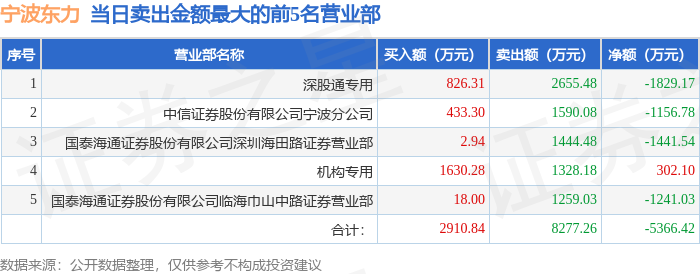 证券之星消息,沪深交易所2025年12月24日公布的交易公开信息显示,宁波东力(002164)因日跌幅偏离值达到7%的前5只证券登上龙虎榜。此次是近5个交易日内第1次上榜。