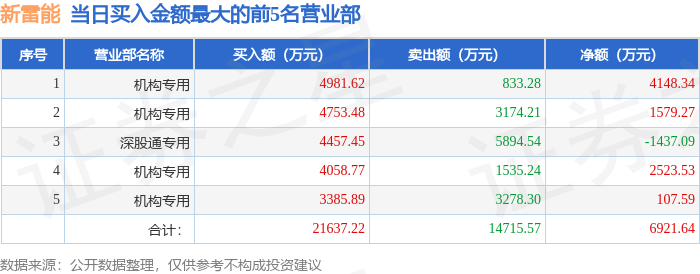 证券之星消息,沪深交易所2025年12月24日公布的交易公开信息显示,新雷能(300593)因日涨幅达到15%的前5只证券登上龙虎榜。此次是近5个交易日内第1次上榜。