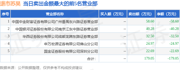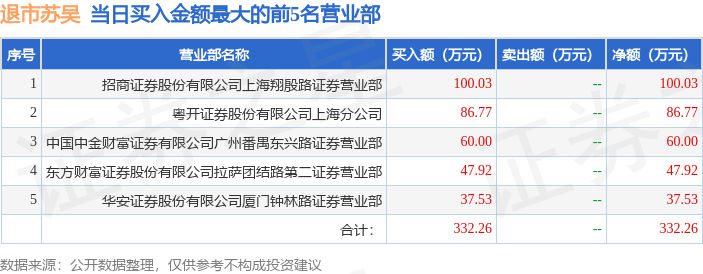 证券之星消息,沪深交易所2025年12月24日公布的交易公开信息显示,退市苏吴(600200)因退市整理的证券登上龙虎榜。此次是近5个交易日内第5次上榜。