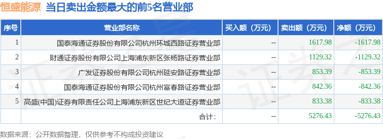 证券之星消息,沪深交易所2025年12月24日公布的交易公开信息显示,恒盛能源(605580)因有价格涨跌幅限制的日收盘价格跌幅偏离值达到7%的前五只证券登上龙虎榜。此次是近5个交易日内第2次上榜。