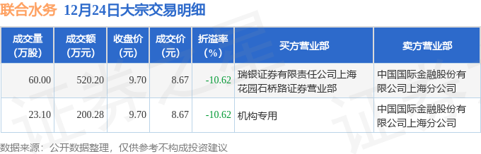 证券之星消息,12月24日联合水务发生大宗交易,交易数据如下: