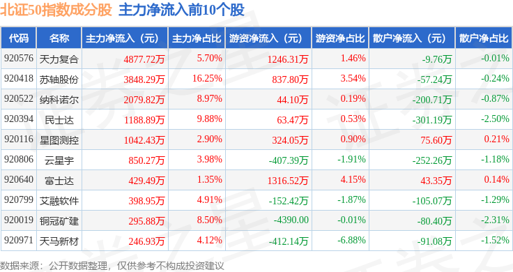 资金流向方面,北证50(899050)指数成份股当日主力资金净流出合计3473.36万元,游资资金净流出合计1.24亿元,散户资金净流出合计7618.02万元。成份股资金流向详情见下表: