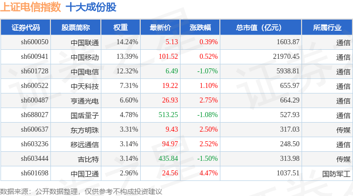 证券之星消息,12月24日,上证电信(000040)指数报收于3954.43点,涨0.99%,成交336.21亿元,换手率0.84%。当日该指数成份股中,上涨的有26家,剑桥科技以7.35%的涨幅领涨,下跌的有5家,仕佳光子以2.11%的跌幅领跌。