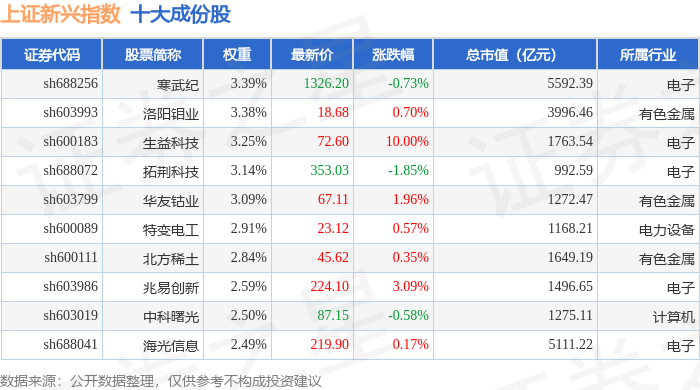 证券之星消息,12月24日,上证新兴(000067)指数报收于8813.36点,涨1.41%,成交999.96亿元,换手率0.93%。当日该指数成份股中,上涨的有41家,生益科技以10.0%的涨幅领涨,下跌的有8家,拓荆科技以1.85%的跌幅领跌。