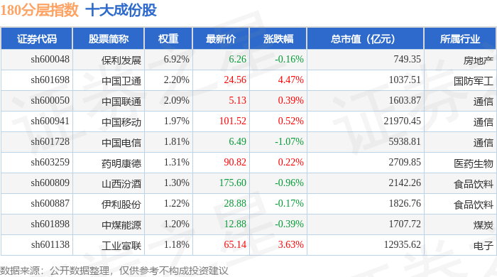 180分层(000093)指数十大成份股详情如下: