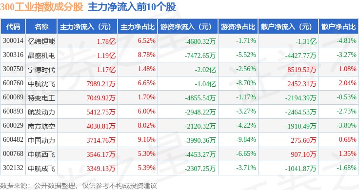资金流向方面,300工业(000910)指数成份股当日主力资金净流出合计10.85亿元,游资资金净流出合计11.33亿元,散户资金净流入合计22.18亿元。成份股资金流向详情见下表: