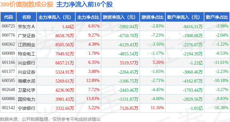 资金流向方面,300价值(000919)指数成份股当日主力资金净流出合计32.37亿元,游资资金净流入合计16.04亿元,散户资金净流入合计16.33亿元。成份股资金流向详情见下表: