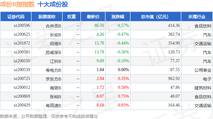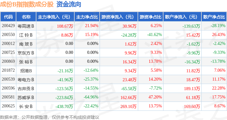 资金流向方面,成份B指(399003)指数成份股当日主力资金净流出合计731.68万元,游资资金净流入合计433.61万元,散户资金净流入合计298.06万元。成份股资金流向详情见下表: