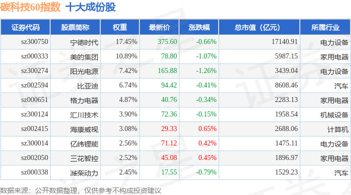碳科技60(399060)指数十大成份股详情如下: