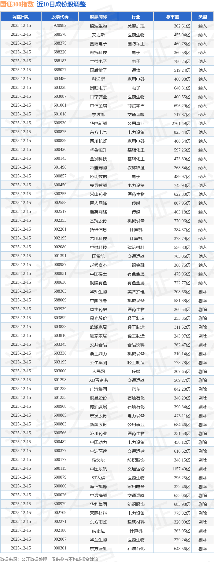 近10日内国证300(399312)指数成份股做了调整,新纳入了30只股票,剔除了30只股票。