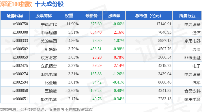 深证100(399330)指数十大成份股详情如下: