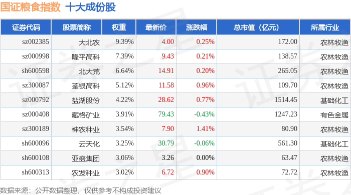 证券之星消息,12月24日,国证粮食(399365)指数报收于13565.12点,涨0.35%,成交173.38亿元,换手率1.79%。当日该指数成份股中,上涨的有32家,百傲化学以4.66%的涨幅领涨,下跌的有13家,海大集团以2.63%的跌幅领跌。